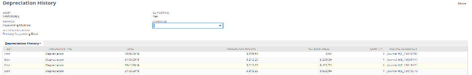 The list in subtab Depreciation history with depreciation records of history for each book with links to book specific journal entries.