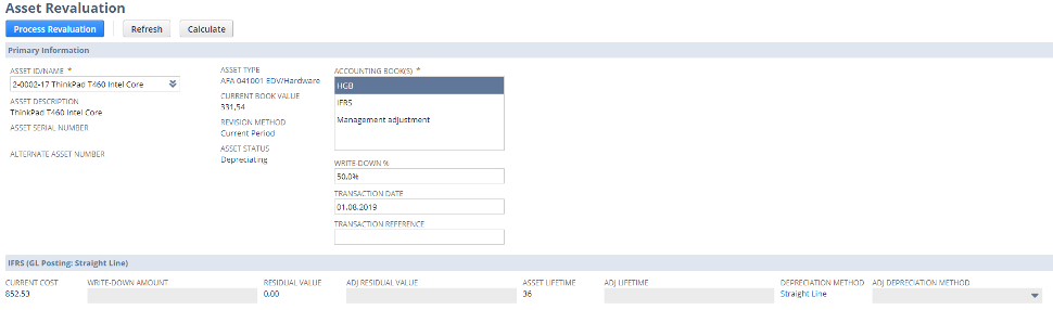 In the FAM module is possible use Asset Revaluation feature to write down or revaluate an asset. It allows to enter a new net book value for the asset and post the difference to the general ledger. Asset revaluation is supported only for accounting methods. It does not apply to alternate tax methods.