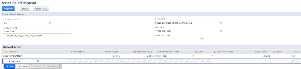 The FAM module enables to write -off or sell an asset. When a fixed asset is disposed an adjustment is made to the depreciation account and the accumulated depreciation . Disposing the asset by sale lets to enter and post the difference between the net book value and the value earned from the sale of the asset to the GL. A sale invoice is created by using the disposal item as the line item. The status of the asset is change to Disposed. During asset disposal the system creates depreciation history records they are linked with journal entries. Journal entry for disposal must be amended manually because is not adequate to Czech accounting standard.