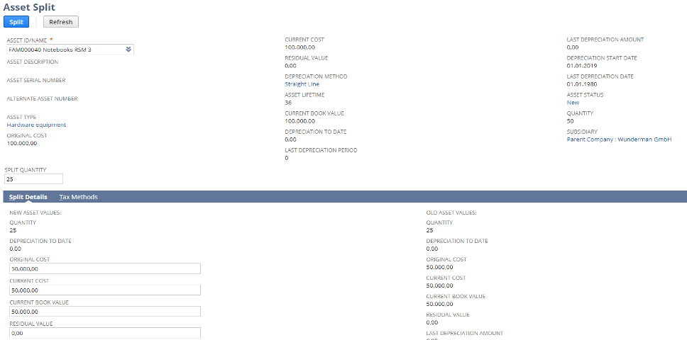 The FAM enables to split asset which is not fully depreciated and quantity more than 1. The Asset split allows to specified quantity to be separated from the original asset and create a new asset. Asset depreciation continue to work on each asset as a whole.