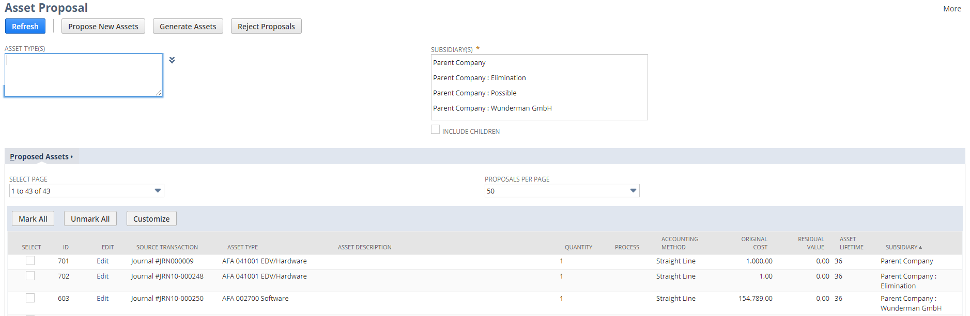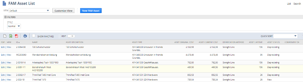The list of Assets is available in mentioned path. The list is NS saved search. The is customizable, there is possibility to add other columns, remove not needed column, change sorting. It is possible to turn on Edit mode, which allowed to update data in columns in online regime. Therefore is allowed to add Available filters , like are Asset type, depreciation methods, Acquisition date etc.